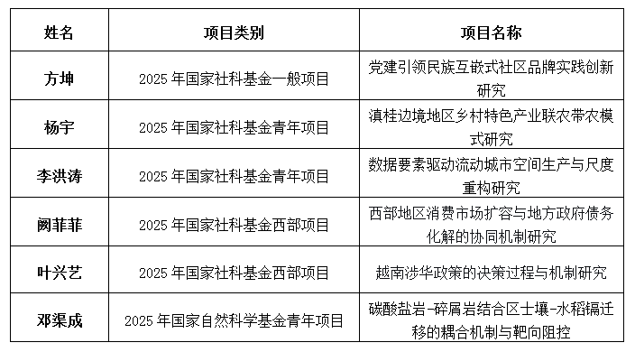 近日,2025年国家社会科学基金年度项目与国家自然科学基金项目立项名单正式公布,我院申报工作取得历史性突破,共有6个项目成功获得立项,创下学院历史最佳成绩。其中包括国家社科基金一般项目1项、国家社科基金青年项目2项、国家社科基金西部项目2项、国家自然科学基金青年项目1项,具体信息如下: