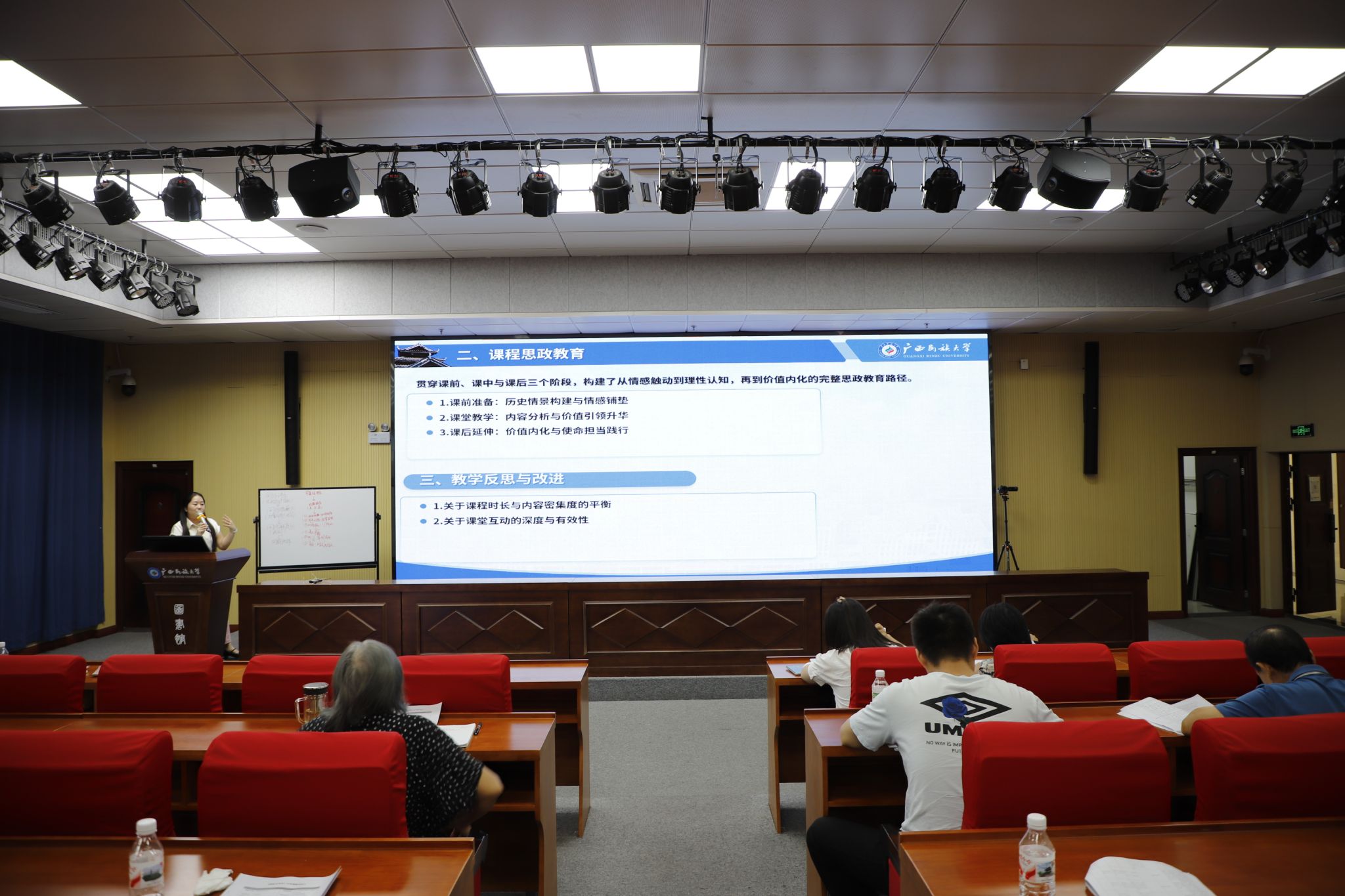 示范课结束后,听课教师围绕赵师苇老师主讲的课堂内容展开课程研讨交流,聚焦课程设计逻辑、教学方法创新及教师发展路径等进行交流总结。学院政治系、公管系教师就课程逻辑、内容密度及互动安排提出优化建议。其他学院教师跨学科交流,赞赏教学设计与板书,并探讨AI时代文科价值与学生批判思维培养。学校、学院教学督导组肯定此次示范课教学层次分明,建议强化思政元素关联、优化课件与板书设计。