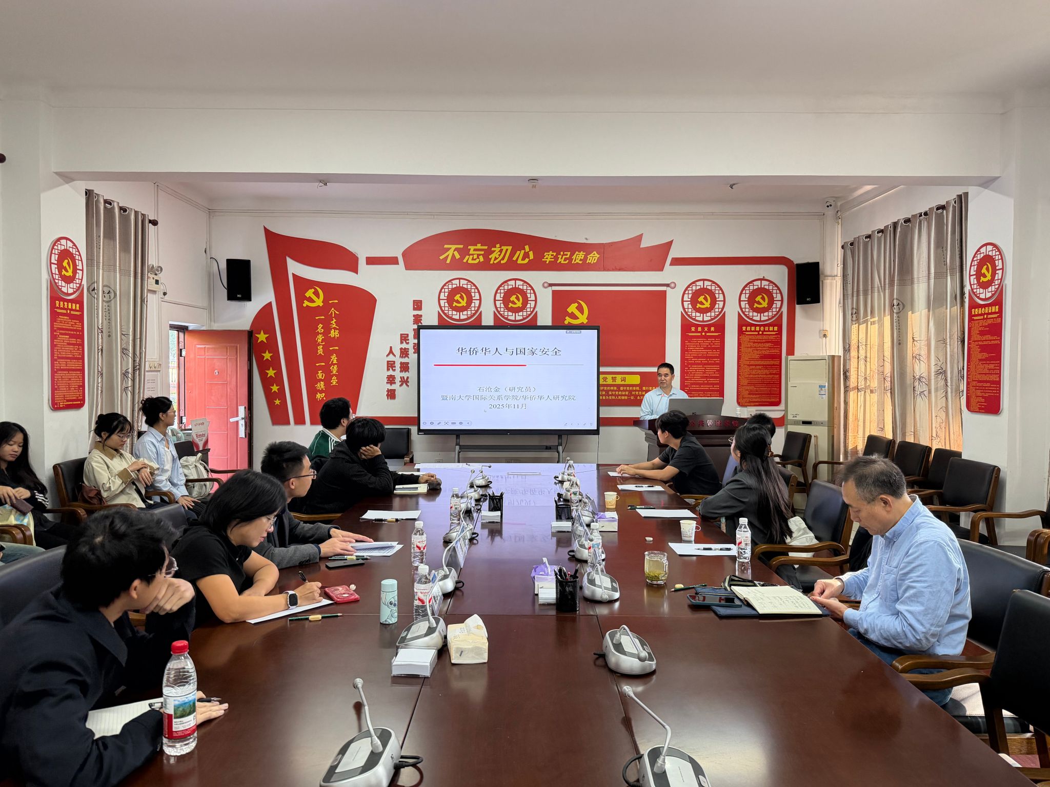 11月15日上午,“国家安全与华侨华人”讲座在博学楼304举行。此次讲座由暨南大学国际关系学院/华侨华人研究院研究员、博士生导师石沧金教授主讲,学院张贵集老师主持,我院师生代表参加讲座。