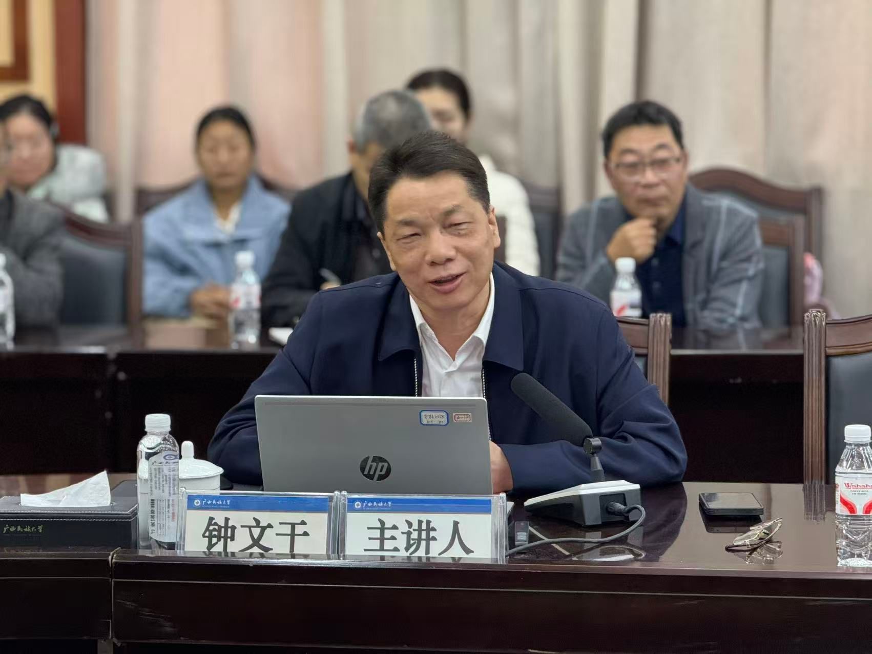 12月16日下午,我院特邀广西壮族自治区社科联副主席钟文干,于国际交流处大会议室为我院师生作题为“如何撰写调研报告和资政报告”的专题讲座。讲座由我院党委书记罗源主持,我院师生代表共同参加。