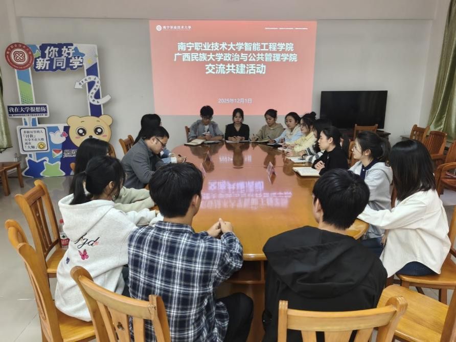 交流期间,党支部一行与南宁职业技术大学智能工程学院举行座谈会。双方围绕基层党组织建设、党员先锋岗作用发挥等内容进行深入交流,并探讨人工智能技术在党建与思政工作中的创新应用场景与融合路径。