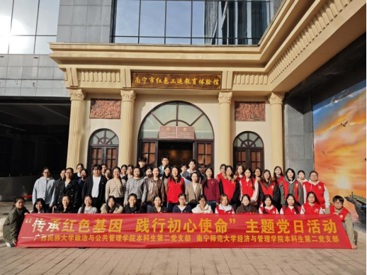 为深入学习贯彻党的二十届四中全会精神,弘扬伟大建党精神,推动党的创新理论入脑入心、见行见效,11月28日,广西民族大学政治与公共管理学院本科生第二党支部(以下简称民大政管学院本二支部)与南宁师范大学经济与管理学院本科生第二党支部前往南宁市红色工运教育体验馆,联合开展“传承红色基因,践行初心使命”主题党日活动。活动共有50名师生党员及入党积极分子参加。