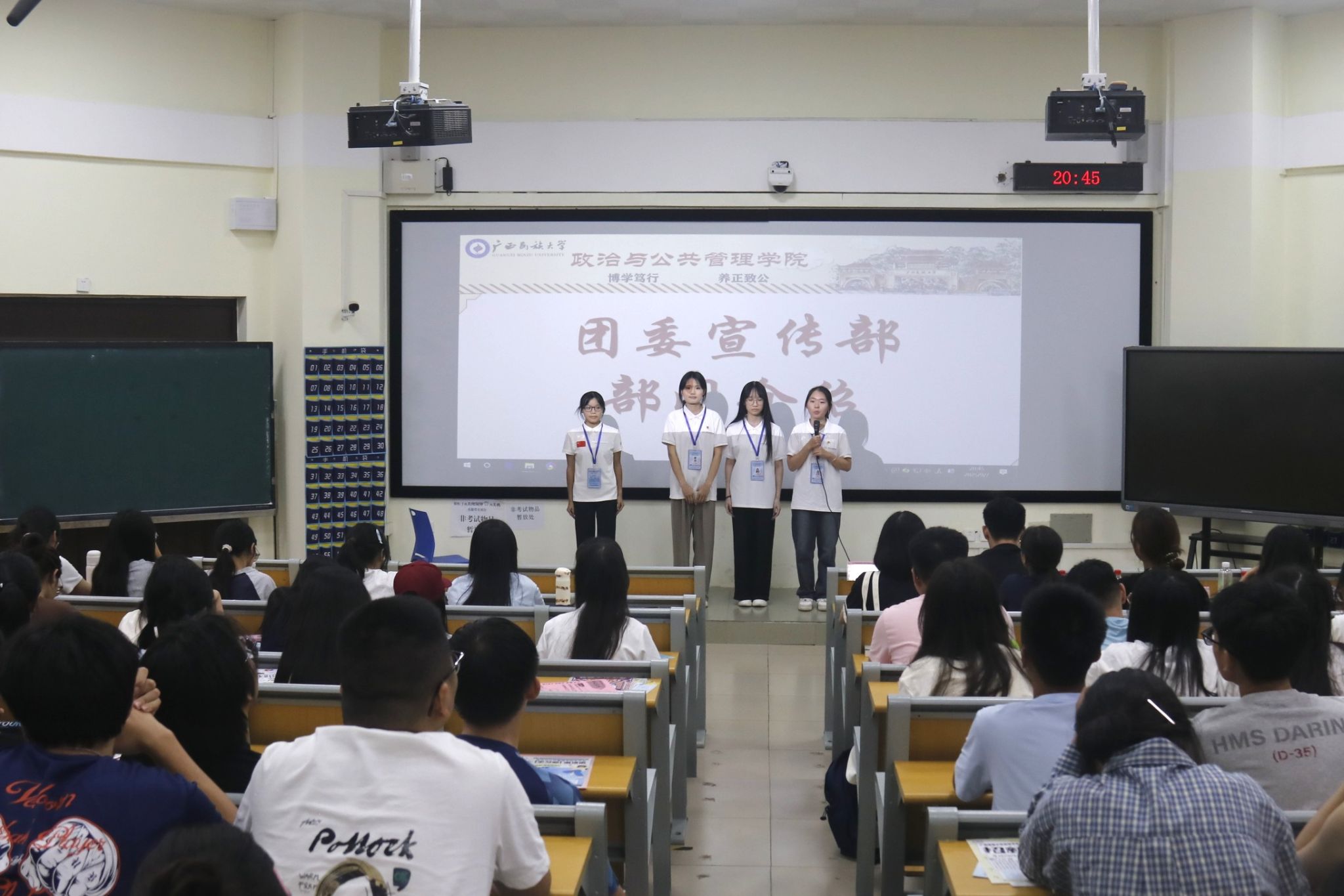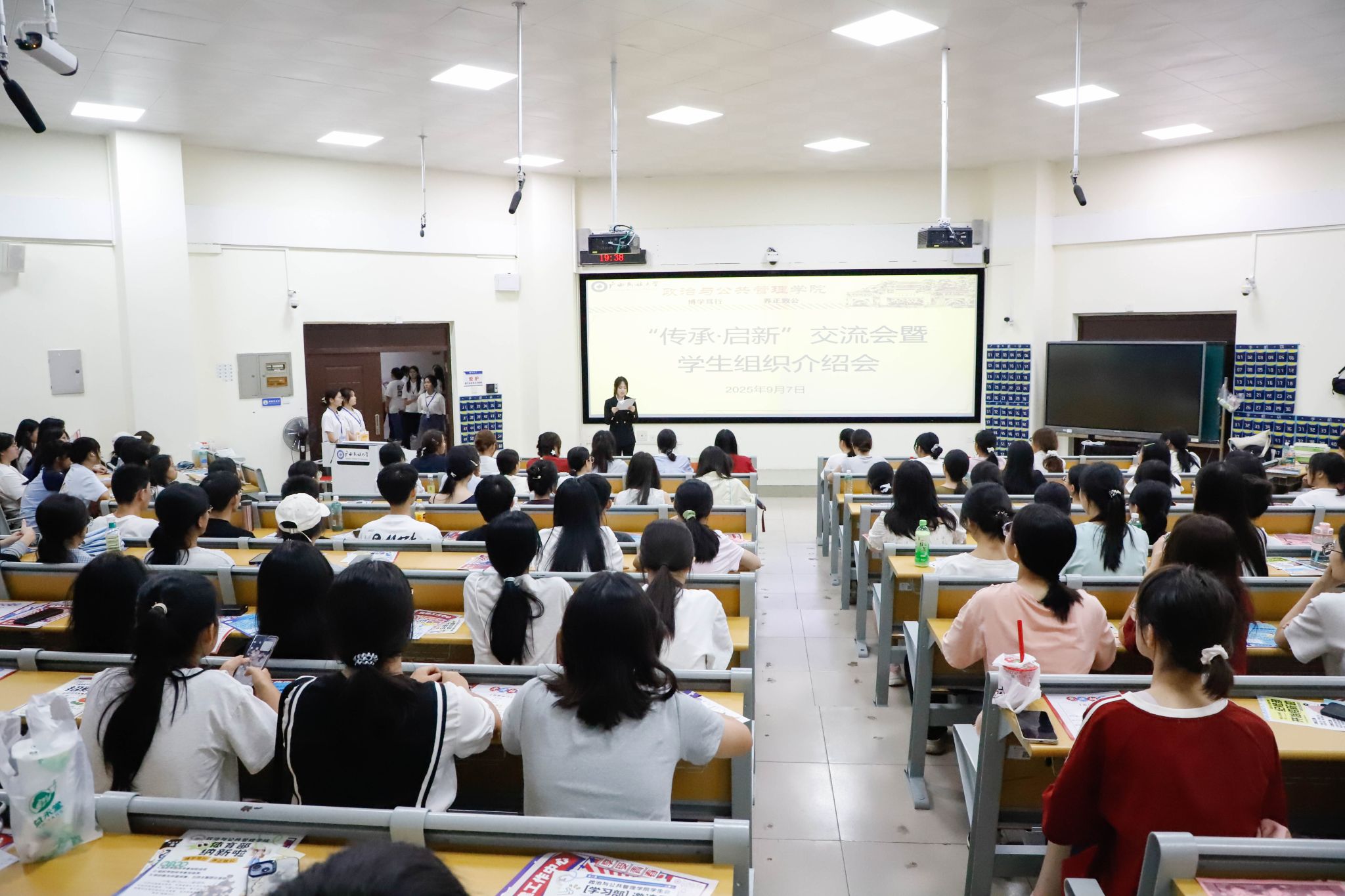 随后共青团广西民族大学政治与公共管理学院委员会、广西民族大学政治与公共管理学院学生委员会、政治与公共管理学院新闻传媒中心、政治与公共管理学院党建工作中心及下设各个部门等学生组织与特色社团向2025级新生进行学生组织介绍。各组织负责人热情地向2025级新生介绍部门职能、特色活动与经验收获,通过宣传海报、视频动画以及现场互动等环节,展现政管学院学生活动的多元魅力与专业特色。